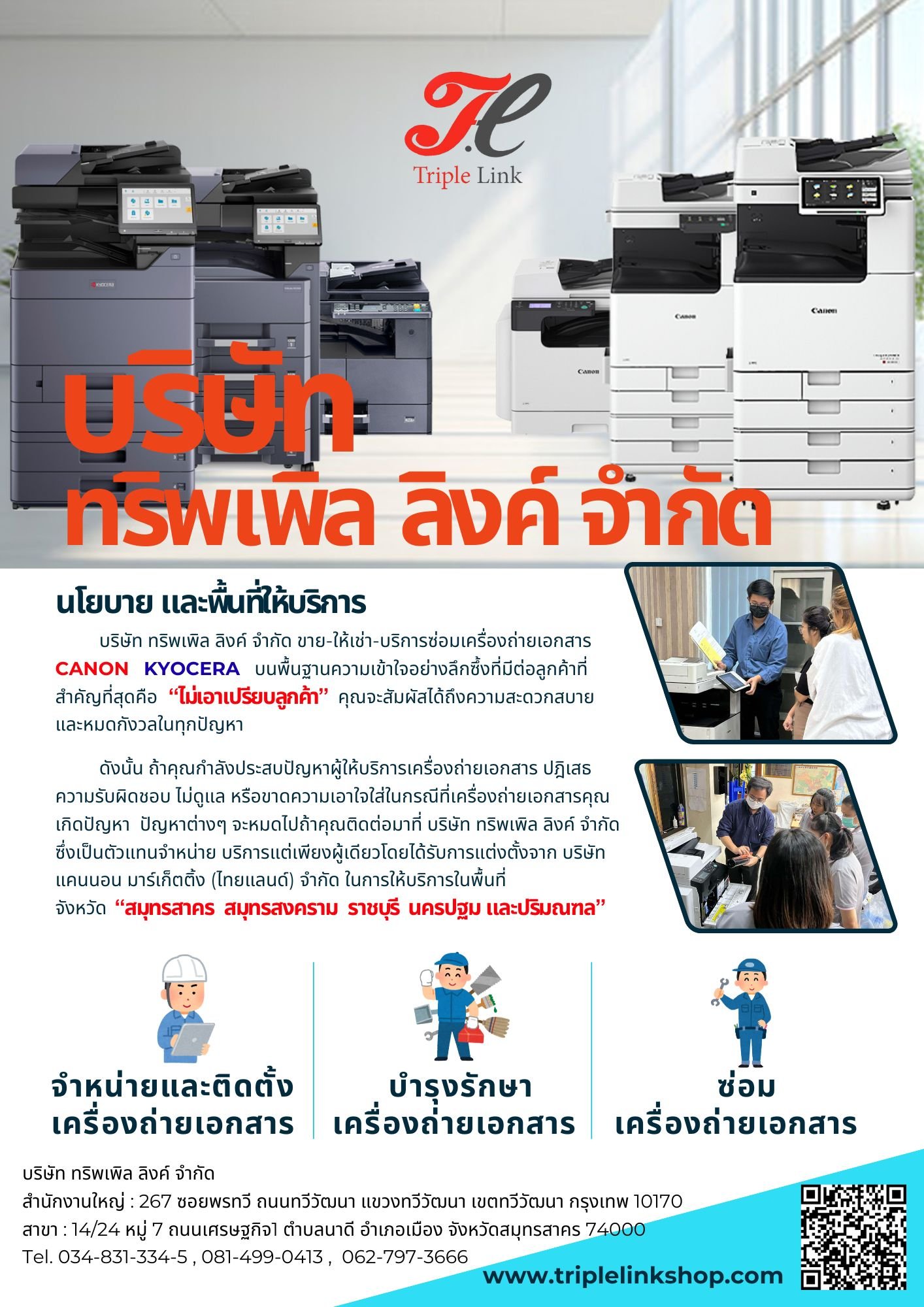 ดังนั้น ถ้าคุณกำลังประสบปัญหาผู้ให้บริการเครื่องถ่ายเอกสารปฏิเสธความรับผิดชอบ ไม่ดูแล หรือขาดความเอาใจใส่ในกรณีที่เครื่องถ่ายเอกสารของคุณเกิดปัญหา ปัญหาต่าง ๆ จะหมดไปถ้าคุณติดต่อมาที่ บริษัท ทริพเพิล ลิงค์ จำกัด ซึ่งเป็นตัวแทนจำหน่าย บริการแต่เพียงผู้เดียวโดยได้รับการแต่งตั้งจาก บริษัท แคนนอน มาร์เก็ตติ้ง (ไทยแลนด์) จำกัด ในการให้บริการในพื้นที่จังหวัดสมุทรสาคร สมุทรสงคราม ราชบุรี และนครปฐม